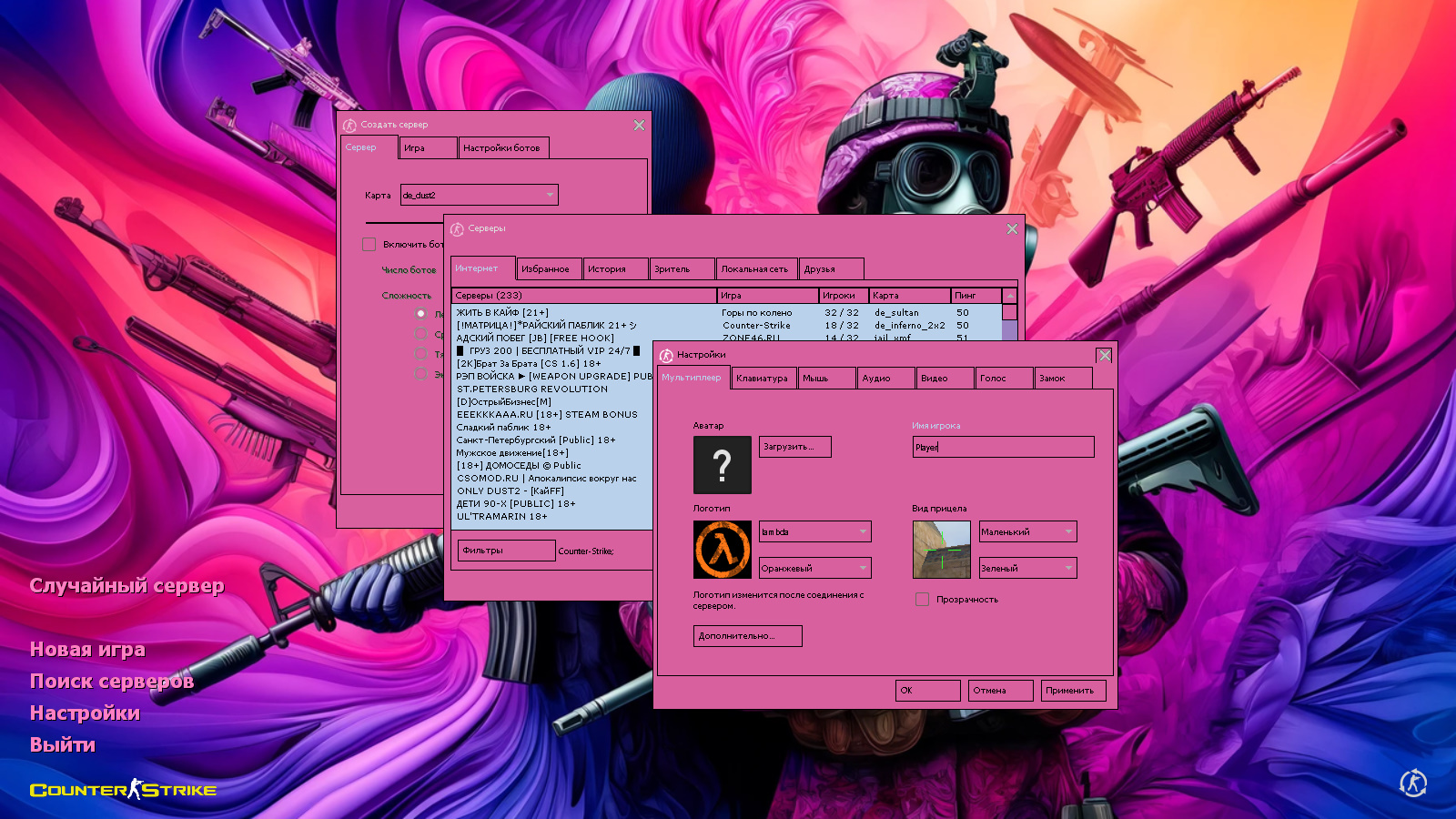 CS 1.6 Bubble Gum — это прокачанная сборка Counter-Strike с 7 обновками, среди которых: 30 розовых и фиолетовых скинов с двумя вариантами перчаток, розовая тема меню, контр-террористы в фиолетовом и розовом цветах в качестве фона главного меню и оптимизированный конфиг. Помимо этого, обновление получили: музыка в меню, радар и значок запуска.Также сборка обладает всеми возможностями оригинальной игры: работает на всех версиях Windows, можно играть как онлайн (250+ серверов), так и с ботами на любых картах, ставить русский никнейм и писать в чате по-русски, устанавливать любые моды.