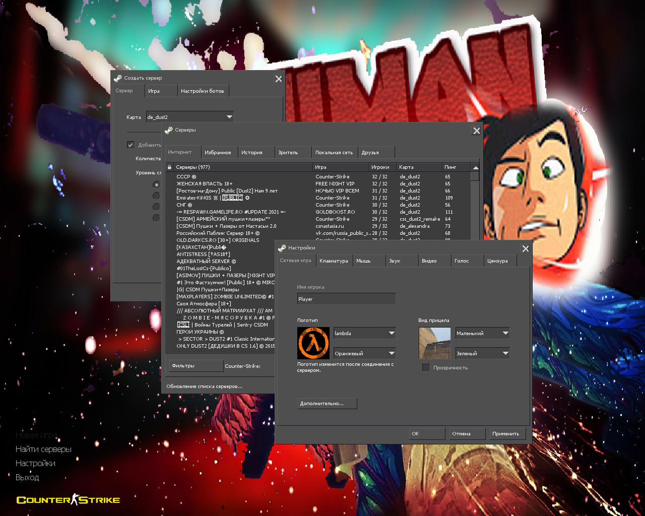 CS 1.6 от Анимана — это сборка Counter-Strike от блогера с ютуб-канала Animan (493+ тыс. подписчиков), которая содержит 8 изменений, среди которых: 10 любимых скинов оружия Анимана, синие CT и красные T модели игроков, серая тема меню, фон М4А1 «Скоростной зверь» и логотипом канала и оригинальный конфиг Анимана. Помимо этого, обновление получили: музыка в меню, радар и значок запуска.Также сборка обладает всеми возможностями оригинальной игры: работает на всех версиях Windows, можно играть как онлайн (250+ серверов), так и с ботами на любых картах, ставить русский никнейм и писать в чате по-русски, устанавливать любые моды.