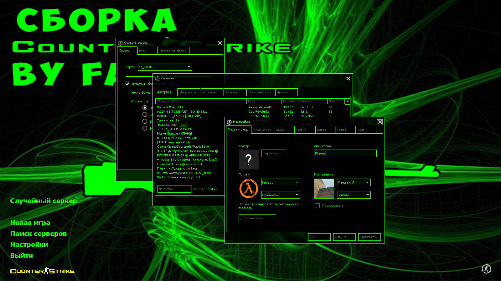 CS 1.6 от Faer Show — это сборка Counter-Strike от блогера с ютуб-канала ★FAER SHOW★ с 6 модификациями, среди которых: 30 скинов оружия на стандартных моделях, черно-зеленая тема меню, силуэт снайперской винтовки AWP в качестве фона главного меню и оптимизированный конфиг. Помимо этого, обновление получили: музыка в меню и значок запуска.Также сборка обладает всеми возможностями оригинальной игры: работает на всех версиях Windows, можно играть как онлайн (250+ серверов), так и с ботами на любых картах, ставить русский никнейм и писать в чате по-русски, устанавливать любые моды.