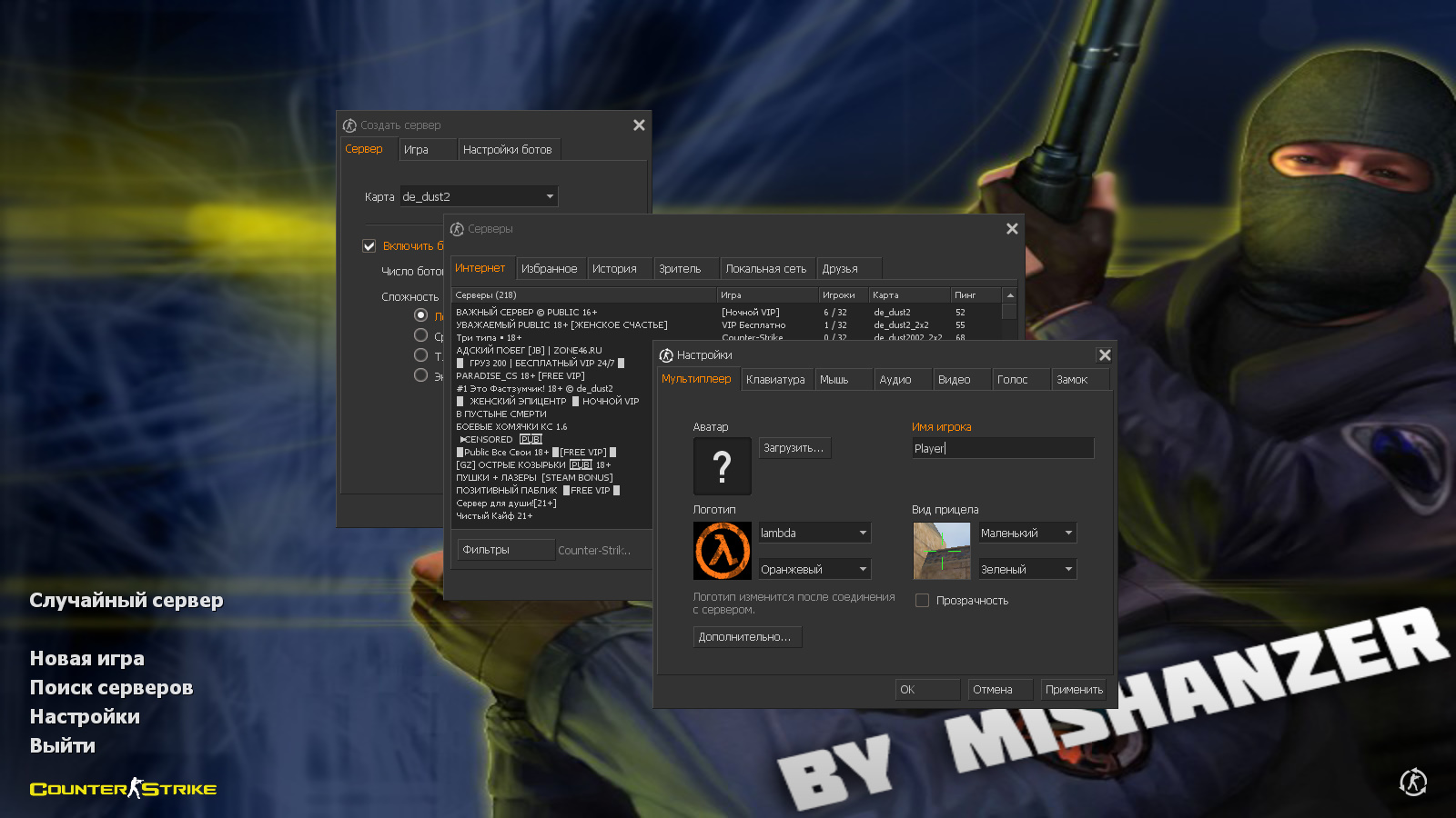 CS 1.6 от Mishanzer — это сборка Counter-Strike от блогера с ютуб-канала MrBeanCS с 5 новинками, среди которых: темная тема меню с оранжевыми элементами, стандартная заставка с никнеймом автора сборки в качестве фона главного меню и оптимизированный конфиг. Помимо этого, обновление получили: музыка в меню и значок запуска.Также сборка обладает всеми возможностями оригинальной игры: работает на всех версиях Windows, можно играть как онлайн (250+ серверов), так и с ботами на любых картах, ставить русский никнейм и писать в чате по-русски, устанавливать любые моды.