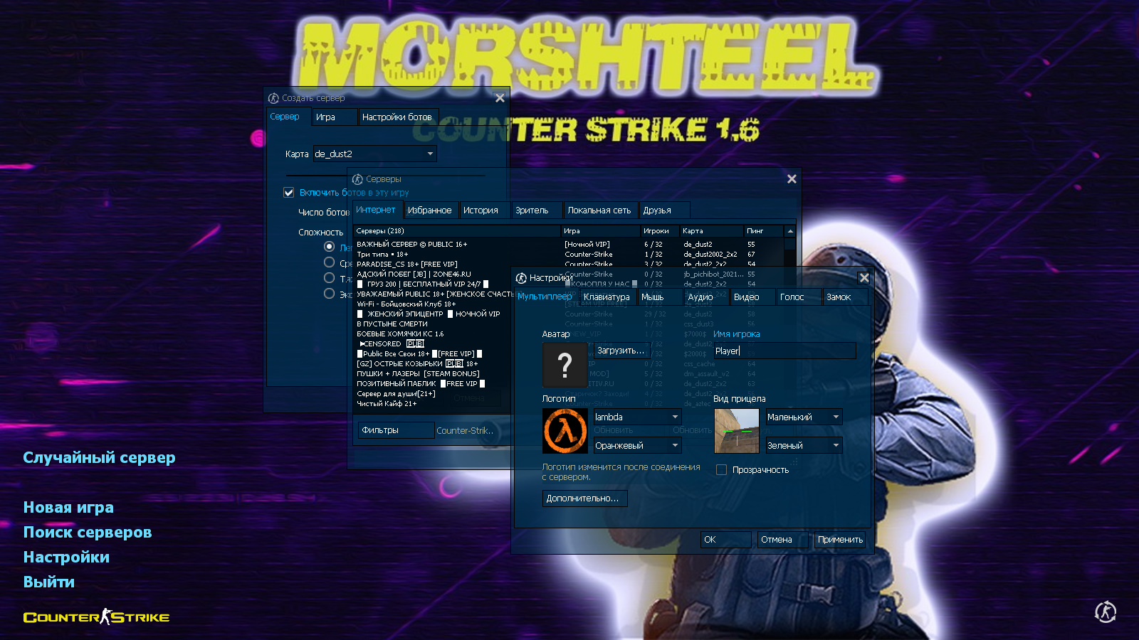 CS 1.6 от Morshteel — это сборка Counter-Strike от блогера с ютуб-канала Morshteel с 7 новшествами, среди которых: 16 скинов оружия от ютубера, синяя полупрозрачная тема меню, контр-террорист и никнейм автора сборки в качестве фона главного меню и оптимизированный конфиг. Помимо этого, обновление получили: звуки, музыка в меню и значок запуска.Также сборка обладает всеми возможностями оригинальной игры: работает на всех версиях Windows, можно играть как онлайн (250+ серверов), так и с ботами на любых картах, ставить русский никнейм и писать в чате по-русски, устанавливать любые моды.