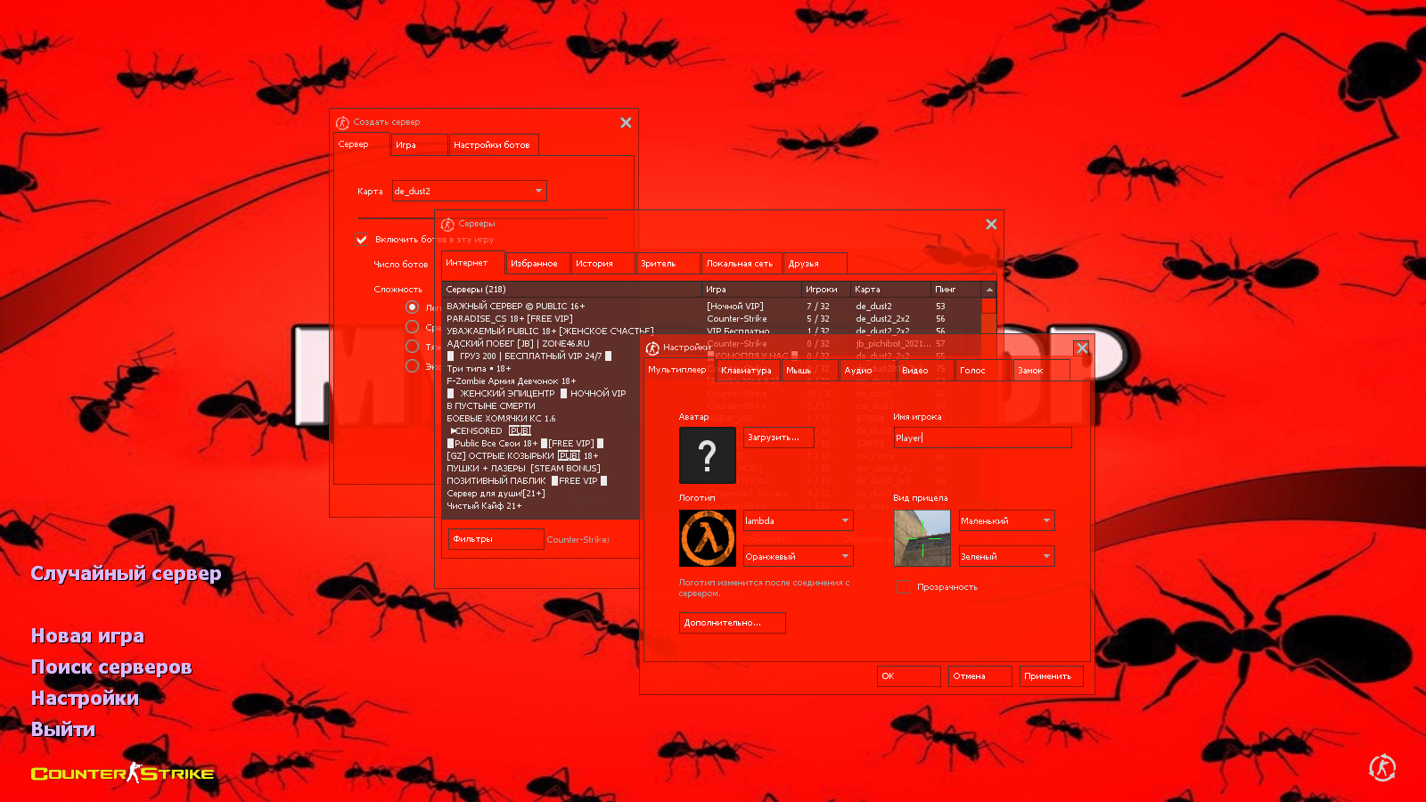 CS 1.6 от muravei top — это сборка Counter-Strike от блогера с ютуб-канала MyraveyTOP с 8 модификациями, среди которых: 30 скинов оружия от ютубера, красные модели террористов и синие модели спецназа, ярко-красная тема меню, никнейм автора сборки MYRAVEI в качестве фона главного меню и оптимизированный конфиг. Помимо этого, обновление получили: звуки, музыка в меню и значок запуска.Также сборка обладает всеми возможностями оригинальной игры: работает на всех версиях Windows, можно играть как онлайн (250+ серверов), так и с ботами на любых картах, ставить русский никнейм и писать в чате по-русски, устанавливать любые моды.