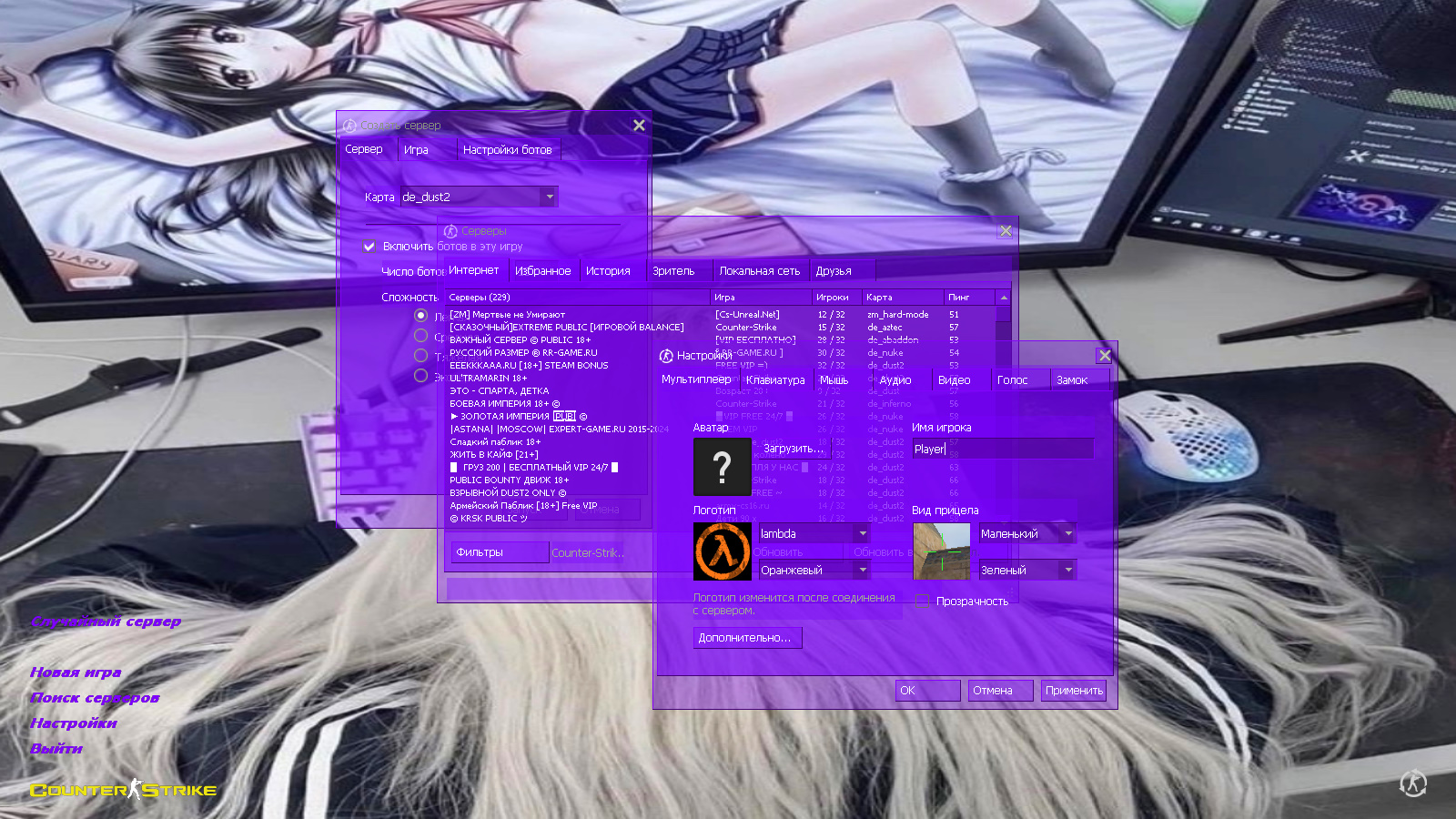 CS 1.6 от Ralyyy — это сборка Counter-Strike от блогера с ютуб-канала Ralyyy с 9 нововведениями, среди которых: 9 скинов оружия с уникальными белыми рукавами и перчатками, минималистичные модели игроков с квадратной головой для удобства стрельбы, фиолетовая полупрозрачная тема меню, анимешница, которая уснула за компьютером в качестве фона главного меню и оптимизированный конфиг. Помимо этого, обновление получили: музыка в меню, небо, радар и значок запуска.Также сборка обладает всеми возможностями оригинальной игры: работает на всех версиях Windows, можно играть как онлайн (250+ серверов), так и с ботами на любых картах, ставить русский никнейм и писать в чате по-русски, устанавливать любые моды.