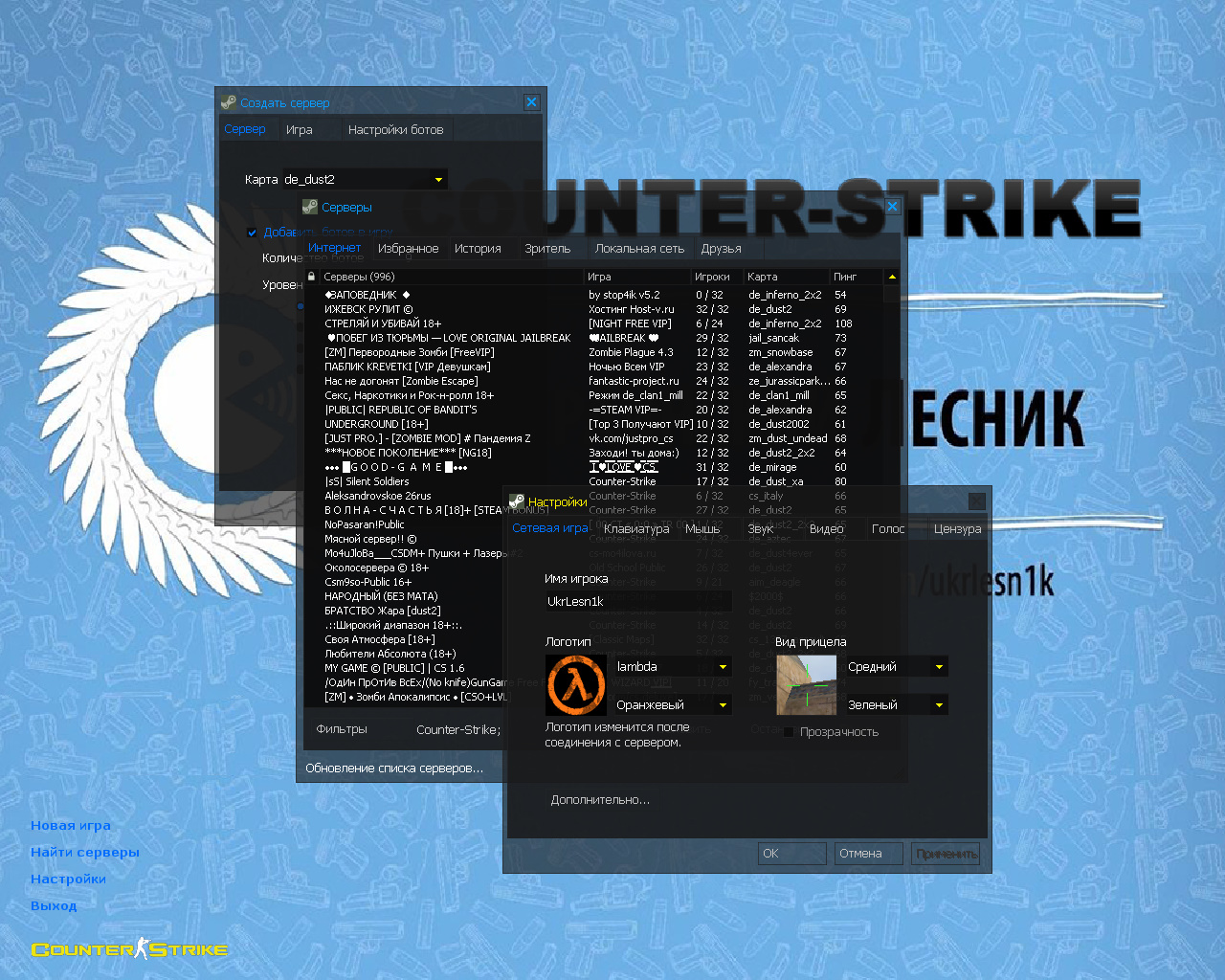 CS 1.6 от Украинского лесника — это сборка Counter-Strike от  блогера с ютуб-канала Украинский Лесник (270+ тыс. подписчиков), которая содержит 7 таких изменений, как: Deagle | Повелитель леса и Кунг-фу, голубой фон в стиле канала, полупрозрачная тема меню и оригинальный конфиг Украинского лесника. Помимо этого, обновления получили: радар, музыка в меню и значок запуска.Также сборка обладает всеми возможностями оригинальной игры: работает на всех версиях Windows, можно играть как онлайн (250+ серверов), так и с ботами на любых картах, ставить русский никнейм и писать в чате по-русски, устанавливать любые моды.