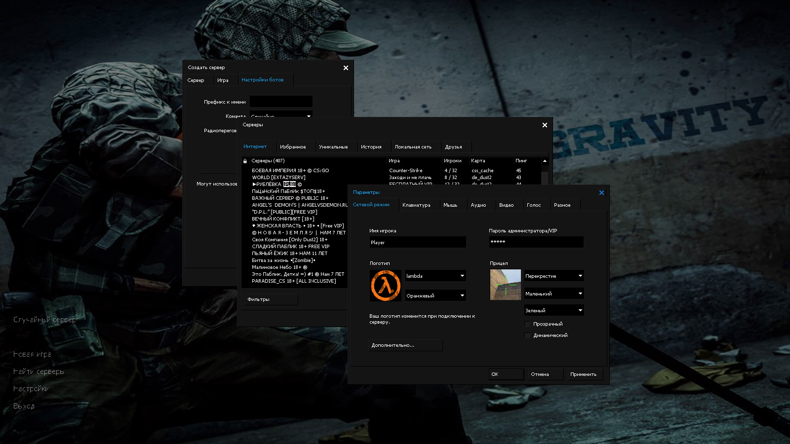 CS 1.6 Gravity — это прокачанная сборка Counter-Strike с 6 дополнениями, среди которых: очень разнообразное оружие, темная тема меню с голубыми элементами и солдат со снайперской винтовкой AWP со скином «Азимов» в качестве фона главного меню. Помимо этого, обновление получили: текстуры карт, снайперский прицел и значок запуска.Также сборка обладает всеми возможностями оригинальной игры: работает на всех версиях Windows, можно играть как онлайн (250+ серверов), так и с ботами на любых картах, ставить русский никнейм и писать в чате по-русски, устанавливать любые моды.