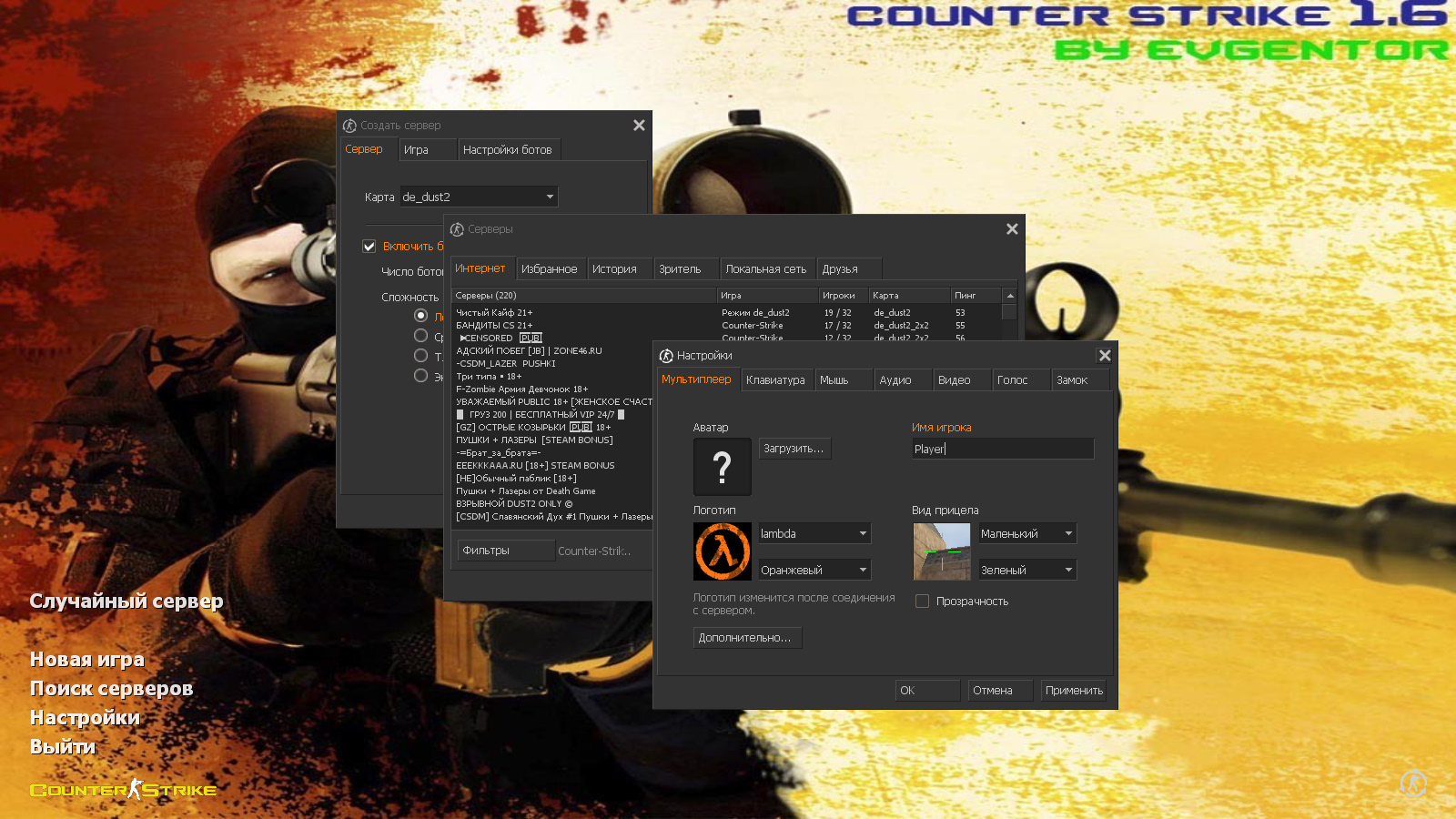 CS 1.6 от Evgentor — это сборка Counter-Strike от блогера с ютуб-канала EvGeNTor SHOW с 6 нововведениями, среди которых: 11 скинов оружия из CS:GO с разными перчатками, красные модели террористов и синие модели спецназа, темная тема меню с оранжевыми элементами, солдат, вооруженный G3SG1 в качестве фона главного меню и оптимизированный конфиг. Помимо этого, обновление получили: музыка в меню.Также сборка обладает всеми возможностями оригинальной игры: работает на всех версиях Windows, можно играть как онлайн (250+ серверов), так и с ботами на любых картах, ставить русский никнейм и писать в чате по-русски, устанавливать любые моды.