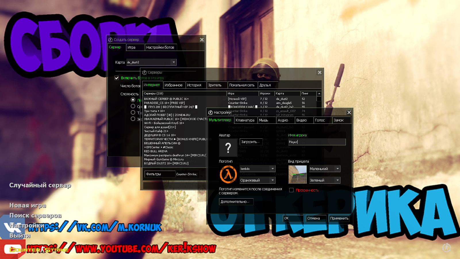 CS 1.6 от Ker1k Show — это сборка Counter-Strike от бывшего ютубера с 7 изменениями, среди которых: 9 любимых скинов оружия от блогера, красные модели террористов и синие модели спецназа, черная тема меню с прозрачными и зелеными элементами, скучающий контр-террорист и курица на Inferno в качестве фона главного меню и оптимизированный конфиг. Помимо этого, обновление получили: музыка в меню и значок запуска.Также сборка обладает всеми возможностями оригинальной игры: работает на всех версиях Windows, можно играть как онлайн (250+ серверов), так и с ботами на любых картах, ставить русский никнейм и писать в чате по-русски, устанавливать любые моды.