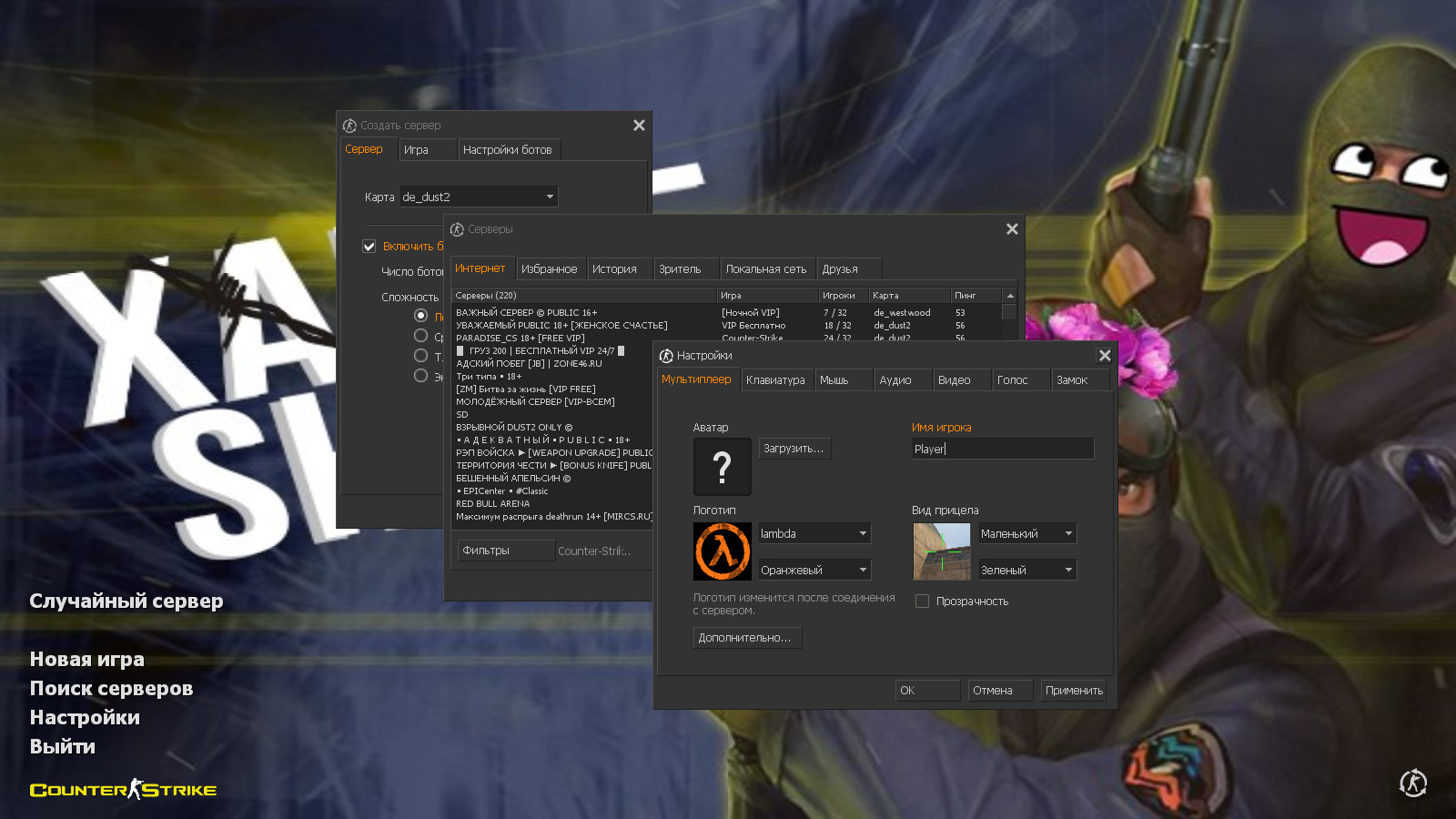 CS 1.6 от XARGE — это сборка Counter-Strike от блогера с ютуб-канала XARGE SHOW с 6 улучшениями, среди которых: 30 скинов оружия с обновленными текстурами и рукавами спецназа, темная тема меню с оранжевыми элементами, мемы и никнейм автора сборки в качестве фона главного меню и оптимизированный конфиг. Помимо этого, обновление получили: музыка в меню и значок запуска.Также сборка обладает всеми возможностями оригинальной игры: работает на всех версиях Windows, можно играть как онлайн (250+ серверов), так и с ботами на любых картах, ставить русский никнейм и писать в чате по-русски, устанавливать любые моды.