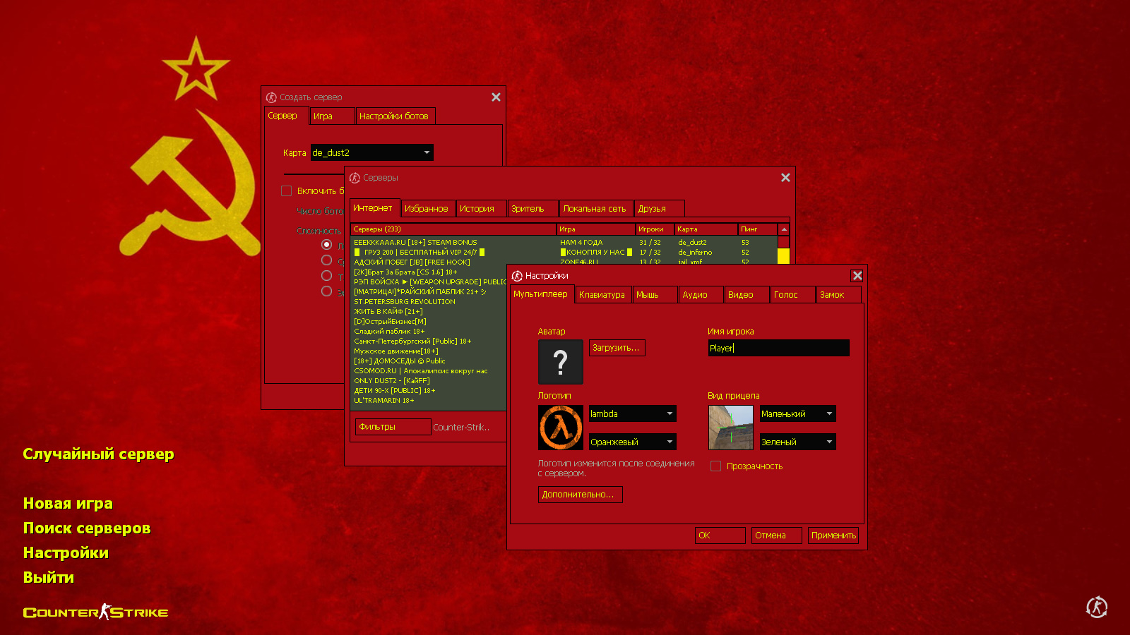 CS 1.6 СССР — это тематическая сборка Counter-Strike с 8 дополнениями, среди которых: 30 моделей старинного оружия с новыми рукавами и перчатками, Сталин за контр-террористов, Гитлер за террористов, красная тема меню с желтыми элементами, флаг Советского Союза в качестве фона главного меню и оптимизированный конфиг. Помимо этого, обновление получили: звуки, музыка в меню и значок запуска.Также сборка обладает всеми возможностями оригинальной игры: работает на всех версиях Windows, можно играть как онлайн (250+ серверов), так и с ботами на любых картах, ставить русский никнейм и писать в чате по-русски, устанавливать любые моды.